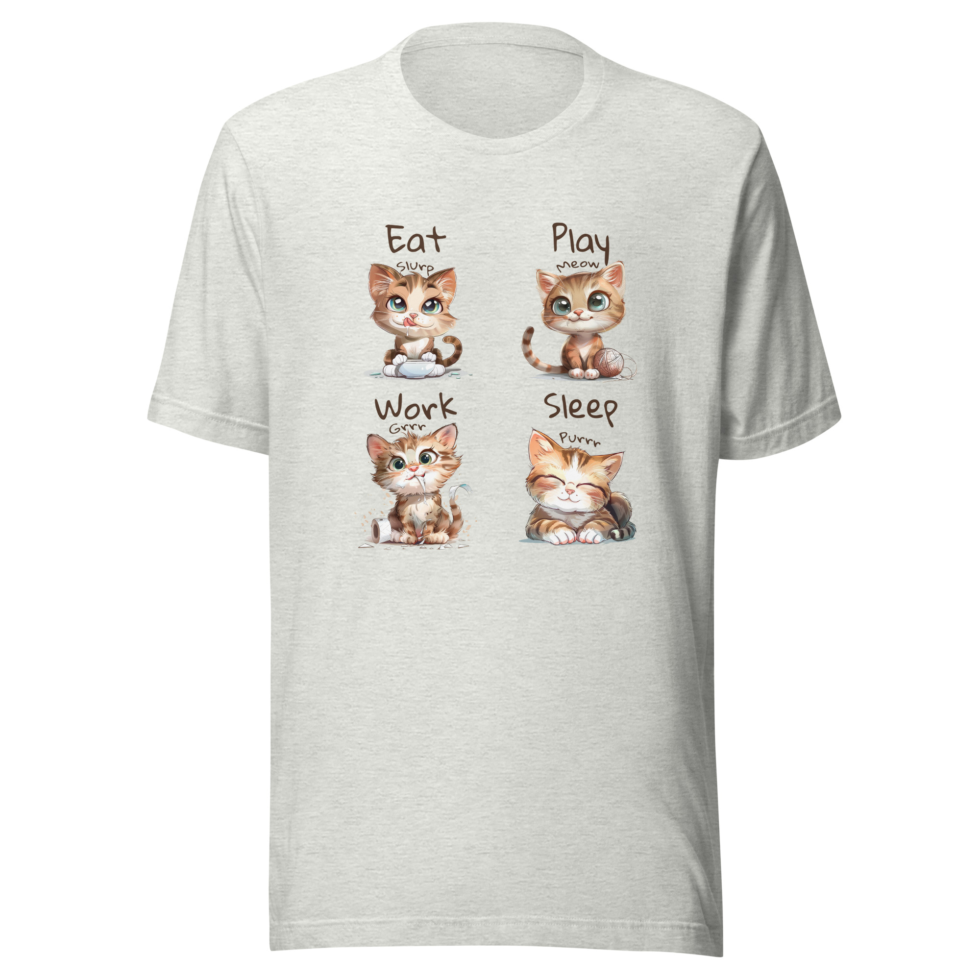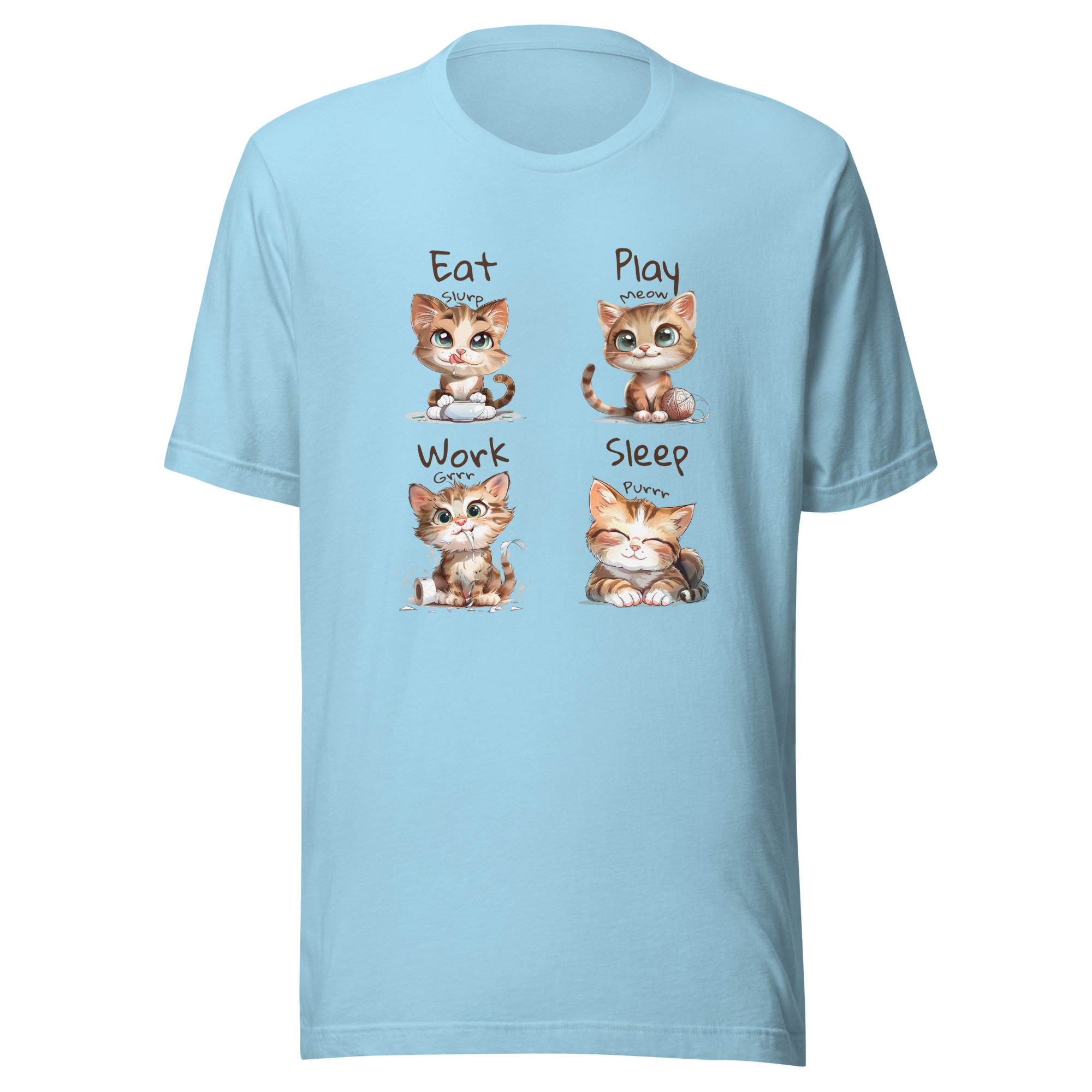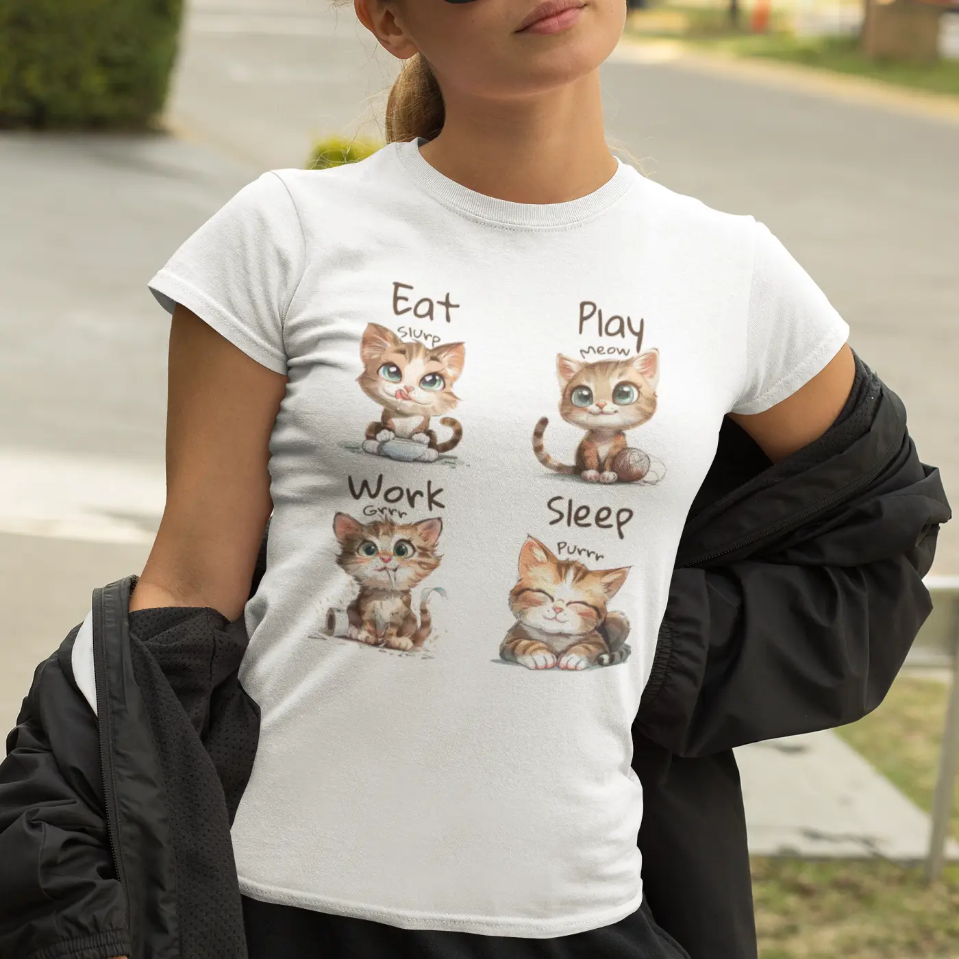 - Cute Kitten T-Shirt with “Eat, Play, Work, Sleep” design – perfect for cat lovers and kitten fans